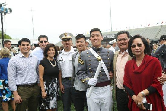 华裔莫家俊(右三起)、莫家伟和莫家辉三兄弟全部入读西点军校,父母及亲友无比骄傲。(美国《世界日报》/洪群超 摄)