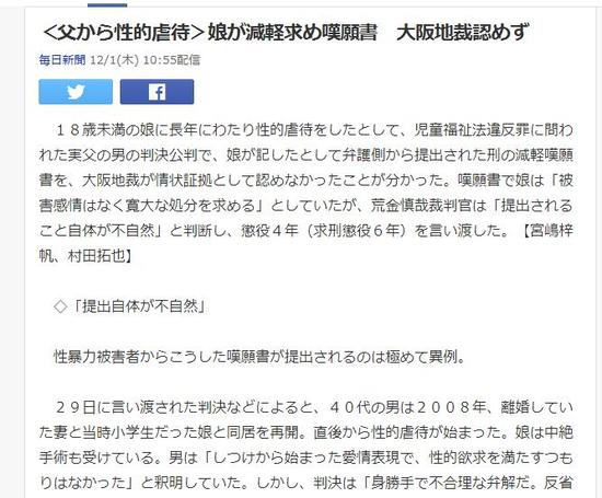 【环球网报道 记者 余鹏飞】据日本《每日新闻》12月1日报道,日本一男子因长期性虐自己未满18岁的亲生女儿于11月29日接受法院审判,但辩护方竟出示了受害者的谅解书,内容是希望法院轻判。对此,日本大阪地方法院不予理会,仍然判处该男子4年有期徒刑。据悉,性暴力受害者提交谅解书要求轻判的事情极其罕见。
