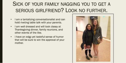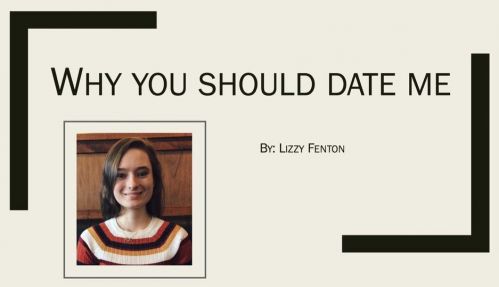 Lizzy Fenton 将自己的所有优势,用PowerPoint 简报格式整理出6页,以“为什么你应该要和我约会”为标题,文字叙述、照片辅助以及数据佐证,逻辑理性,排版清晰。