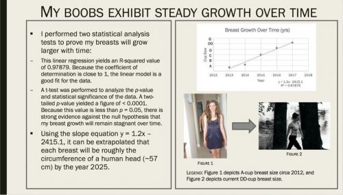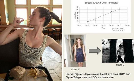 “我提供两份数据,以此证明我的胸部会随着过时间渐渐增大”,同时列算出公式、曲线图,计算出我的胸部在未来几年内的成长预测值,并附上两张对比照以供参考。
