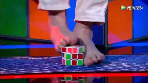 阙建宇脱下鞋子,用脚控制一个魔方,双手也各拿一个魔方,开始还原。他脚下的魔方最先还原,之后手上的魔方也顺利还原,仅用时55秒,精彩的表演赢得现场观众欢呼。