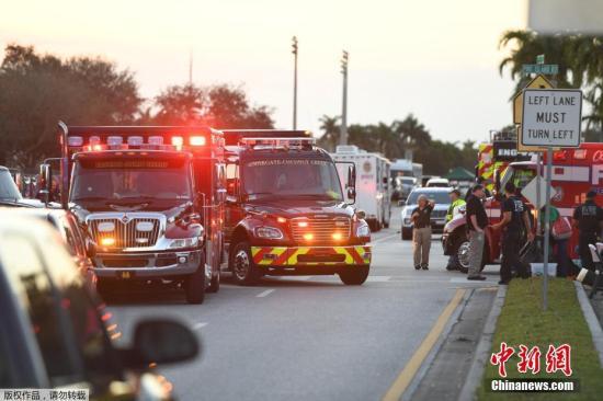 资料图:当地时间2月14日下午2点25分左右,美国佛罗里达州南部帕克兰一所高中发生枪击案,目前已致至少17人死亡,多人受伤。