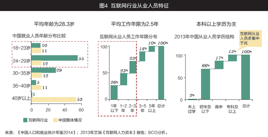 打破论资排辈的传统,高学历年轻人获得更多的发展机会。据统计,互联网行业从业人员的平均年龄为28.3岁,平均工作年限为2.5年,学历背景以本科为主。互联网在中国从1994年开始起步,目前发展只有21年的历程,新兴行业的特征和高技术密度,再加上“快节奏、强竞争”的行业特点,决定了其从业人群年轻化、高学历的特点(见图4)。