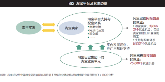 若是仅从直接创造的就业机会来看,在阿里巴巴(微博)集团内部,直接服务于淘宝业务单元的工作岗位不足5000个。但是,当把眼光放宽到整个生态圈,淘宝平台所带来的就业影响远大于此。首先,借助淘宝平台,众多个人通过自开网店实现了就业。据中国就业促进会2014年2月发布的报告,淘宝在报告调查期间共有339.71万家活跃网店,若按平均每个网店雇佣员工数为2.55人计算,淘宝平台创造了866.22万个就业机会。在此之上,被调查网店中,有30.7%的网店在未来一年有扩招计划,平均每个网店计划招工3人。以此推算,淘宝平台在未来一年,还将再增加313万个新的就业机会。