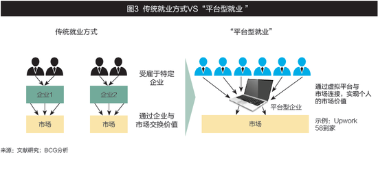互联网的出现降低了交易成本。交易成本的下降使得跨越企业边界的协作成为可能。无论是知识工作者,还是体力工作者,他们发挥自我能力、与市场连接和实现自我价值不需要再完全依附于企业。而各种互联网平台的出现,更是进一步推动这种趋势的发展,自由工作者群体规模日益扩大(见图3)。