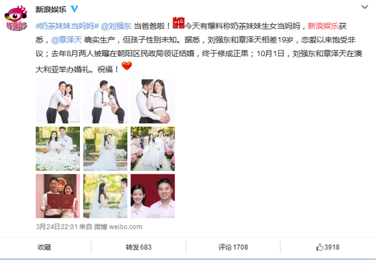 24日下午,有网友在微博爆料奶茶妹妹升级当妈妈了。据新浪娱乐打探,奶茶妹妹确实已经生产,刘强东在公司早会上透露了这一信息,但孩子性别未知。