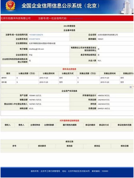 前几日傍晚流传出一则消息北京市工商局企业信用信息网查出“北京玖阳晟禾科技公司”2013、2014年高达百亿的各项财务数有误,极有可能是信息系统把单位为元的数据自动默认为万元所致,目前这一说法尚待北京市工商局查证确认,也有待该公司提供相关证据。