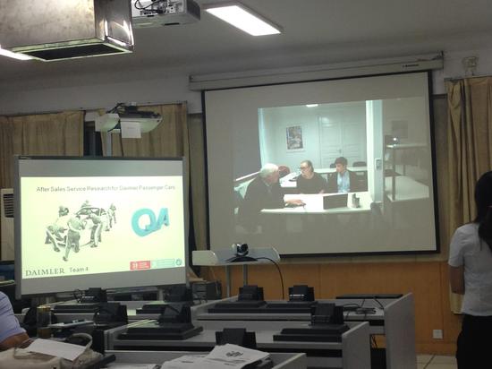 在最后的视频答辩环节中,德国、俄罗斯和中国上海三所高校的的商学院学生通过视频联线的方式,分组就最终案例解决方案进行总结和答辩,Bodo Abel博士和戴姆勒AG的几位高管在聆听了大家的PPT陈述后,就陈述中的内容提出问题并做出评价。我们小组的可行性解决方案获得了不错的反馈,为奔驰下一步在俄罗斯和中国的战略提供了有用的参考信息,我们4个月来的辛苦努力得到了认同和肯定。