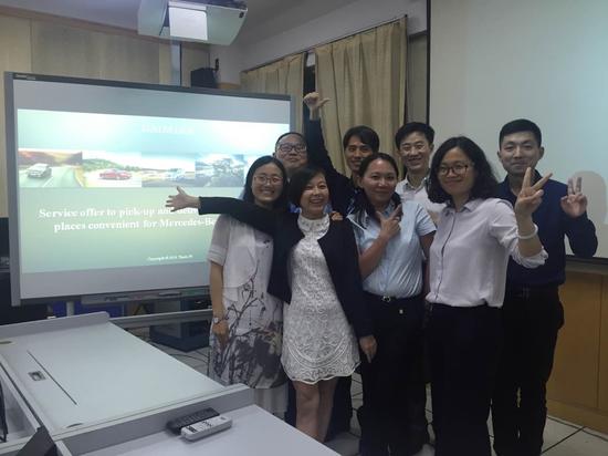 整个项目过程中,最有感触的还是和俄罗斯圣彼得堡国立经济大学的三位商学院学生之间的合作。因为中国和俄罗斯有5个钟头的时差,所以每次讨论都需要时间上的配合,同时也要求回复的即时性。大家尝试了使用各种沟通工具,开始是邮件沟通,但因效率太低放弃了。后来开始使用Skype,但体验还是不够方便,最终决定使用微信做为最终的沟通渠道,俄罗斯同学们在尝试后欣然接受了这种方式。于是我们在长达4个月的时间里,逐步开展咨询活动,首先制定了初步方案、然后研讨、做问卷调研、收集数据、戴姆勒高管访谈、形成PPT报告,阶段性汇报成果、修改更新报告内容等等一系列工作,这些工作都是基于两个国家的学生无障碍的沟通才得以完成的。当然,期间也有意见的不一致,但这些问题最终都得以解决,大家分工合作,相得益彰。在这段期间里,有两个人需要感谢,他们是来自VOLVO中国的史言春和奔驰中国的吴久凌,他们作为外援给予了相当多中肯的建议,正是因为他们在汽车行业多年的经验,使得我们走在了正确的研究方向上。