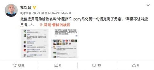 9月23日消息,微博实名认证用户曝光的朋友圈截图显示,疑似马化腾在张小龙朋友圈下的留言透露了微信“应用号”改名“小程序”内幕:苹果不让叫应用号。