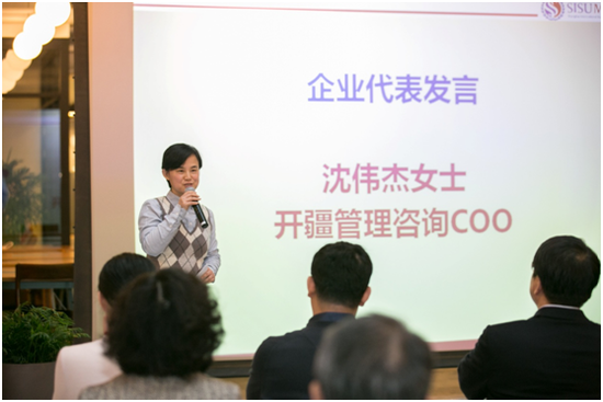 之后,企业方代表开疆管理咨询COO沈伟杰女士回顾了开疆和上外联合举办的Mentor-Mentee项目的发展和成果,对双方未来的合作做出了展望,并寄语MBA学子。最后,MBA学生代表T-keeper创始人吕鹏就自身在校企合作平台中的收获进行了分享。