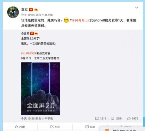 关于苹果今年的新款iPhone手机,外媒近期不断曝光称将于9月12日发布。对此,有网友称“小米MIX 2比iphone8抢先发布1天,看来雷总知道先博眼球。”网友们猜测,小米的策略就是希望赶在苹果iPhone发布之前一天,正式发布全面屏旗舰,与iPhone 8争夺市场热点。雷军则回应称,发布时间“撞车”是因为“场地是提前定的,纯属巧合。”