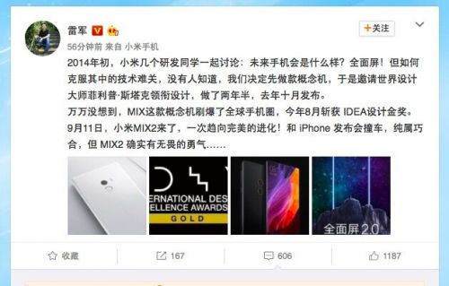 雷军微博今日发布的原文为:“2014年初,小米几个研发同学一起讨论:未来手机会是什么样?全面屏!但如何克服其中的技术难关,没有人知道,我们决定先做款概念机,于是邀请世界设计大师菲利普·斯塔克领衔设计,做了两年半,去年十月发布。万万没想到,MIX这款概念机刷爆了全球手机圈,今年8月斩获 IDEA设计金奖。9月11日,小米MIX2来了,一次趋向完美的进化!和 iPhone 发布会撞车,纯属巧合,但 MIX2 确实有无畏的勇气……”