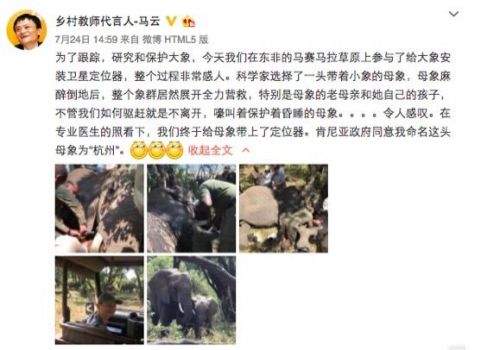 今年7月,马云到访肯尼亚等国,他也从密集的行程中挤出时间,跟科学家、野生动物医生一起,到东非的马赛马拉草原给大象安装卫星定位器,以跟踪,研究和保护野生象群。
