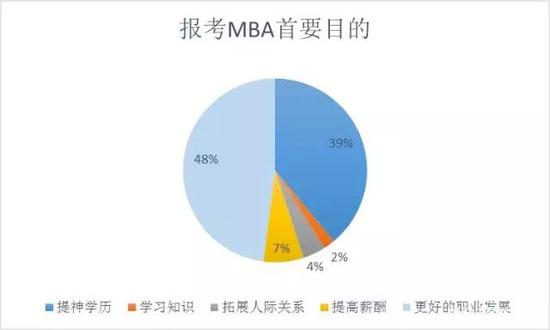 调查中,有48%的MBA报考者为了获得更好的职业发展而选择攻读MBA,另有39%的报考者为了提升学历而选择攻读MBA,也有少数报考者为了改善薪资待遇、拓展人际关系或学习知识而选择报考MBA。不过,抱着学习知识的初衷选择攻读MBA的人群仅占总调查人数的2%。获得更好的职业发展和提升学历是大多数报考者选择攻读MBA的首要目的。
