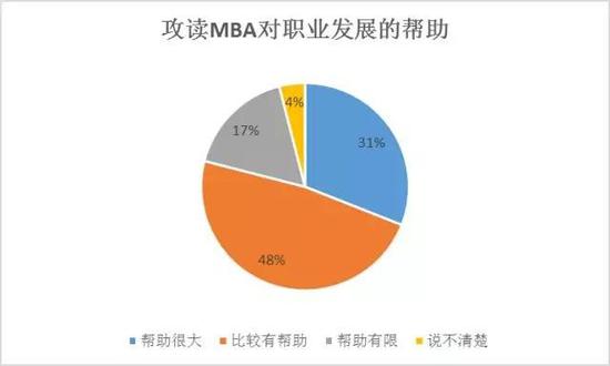 调查显示,31%的MBA学员认为攻读MBA对其职业发展帮助很大,48%的学员认为攻读MBA对其职业发展比较有帮助,仅有17%的学员认为对其帮助有限。