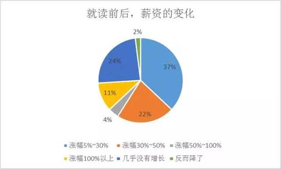 如图,所有被调查人群中,有37%的人在攻读MBA后薪酬涨幅在5%~30%之间,22%的人薪酬涨幅在30%~50%之间,同时也有一定比例的人认为攻读MBA后薪酬几乎没有增长,这部分人数占比达24%。也有一小部分人在攻读MBA后薪酬涨幅在100%以上,占比达11%;涨幅在50%~100%之间的人数较少,占比4%;另有2%的人认为攻读MBA后薪酬不但没有增长反而下降了,不过这部分人数相对较少。