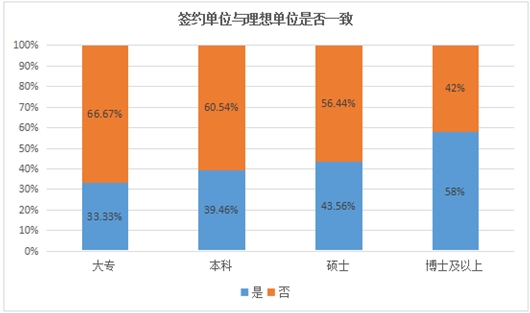 但随着求职者学历提升,应届生签约岗位与所学专业的匹配度逐渐提高,签约单位与理想单位一致的比例也明显提高。
