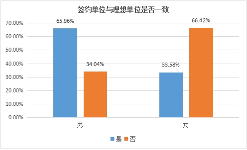 值得注意的是,不同性别,对就业单位的选择结果截然不同。报告显示,女性比男性更难签约理想单位,66.4%的女性应届生签约单位并非理想单位,而男性应届生该比例仅为34%。