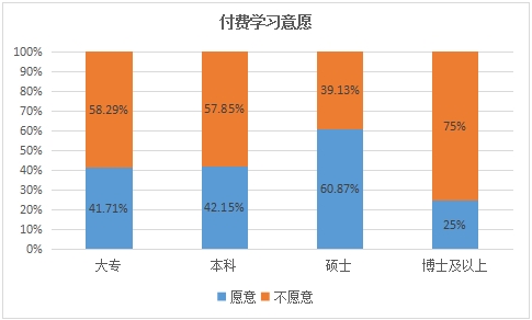 其中,44%应届生表示愿意付费学习大学生就业相关指导课程,且学历越高,付费学习意愿越强,至硕士生而达到最大比例,高达60.87%。