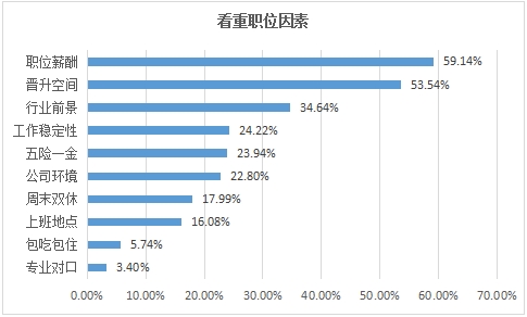 报告显示,签约时,学生们最看重职位薪酬、晋升空间和行业前景三个方面。其中,职位薪酬以59%的比例,高居应届生择业标准第一名,而专业对口与否,则“沦落”为应届生最不看重的因素,排在工作稳定性、公司环境、五险一金、周末双休等客观因素之后。