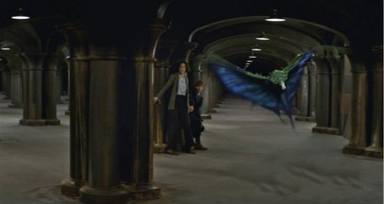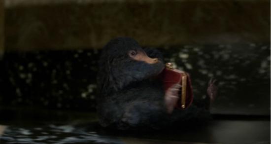 啊哈,一只真正的神奇动物耶!从电影名字上来看似乎蛮有道理的。纽特扔出一件小东西,然后从里面飞出这只可爱的孔雀蓝带翅膀动物——好像看起来不太熟悉……