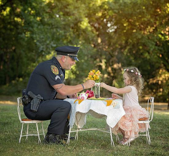 不久前在德克萨斯罗莱特,有天下午,下士警员帕特里克·瑞手持镶有粉色小花的迷你杯,假想着杯中有水,给两岁的小小女主人贝斯丽斟茶。这场户外茶会是为了纪念罗莱特的警官拯救贝斯丽·诺威满一周年。