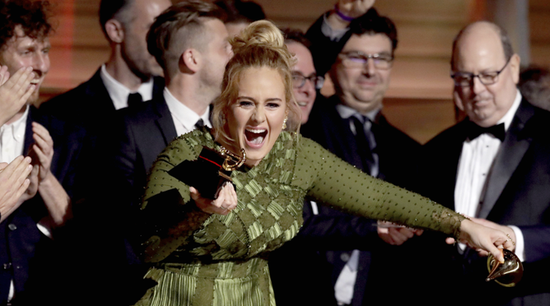 今夜最大的赢家阿黛尔,共赢得五项格莱美奖,其中包括年度制作《Hello》以及年度专辑《25》,成功击败碧昂斯。