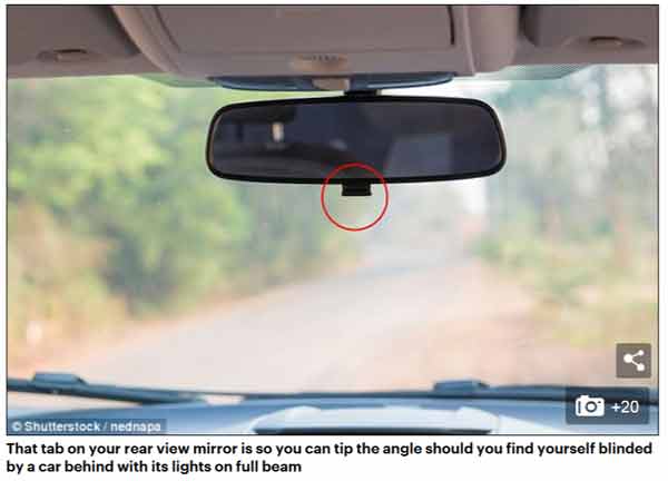 遇到后方有刺眼强光时,你可以掰一下车内后视镜上的小黑钮来转换后视镜角度。