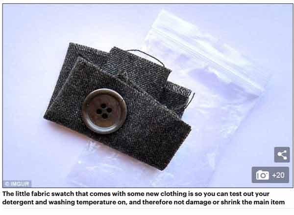 和新衣服一起配赠的小块布样可以用来测试你的洗涤剂和清洗温度是否合适,以免由于直接清洗而使新衣服受损或者缩水。