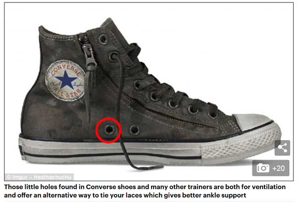 运动鞋例如匡威鞋上的这些小孔一是用来透气二可以用来系鞋带以保护脚踝。