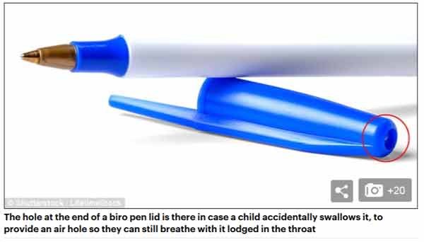 The small hole at the end of biro pen, for example, is there in case a child accidentally swallows it, to provide an air hole so they can still breathe with it lodged in the throat; while the hole in a plane window is to prevent it from imploding should one of the three panes break.