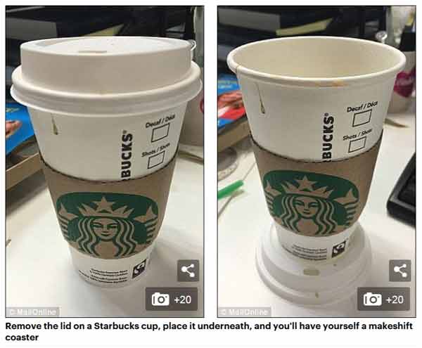 将星巴克的杯盖放到杯底,它便成了一个临时杯垫。