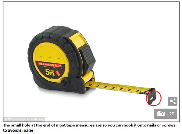 许多卷尺尾部的小洞可以将卷尺固定在钉子或螺丝上避免滑动。