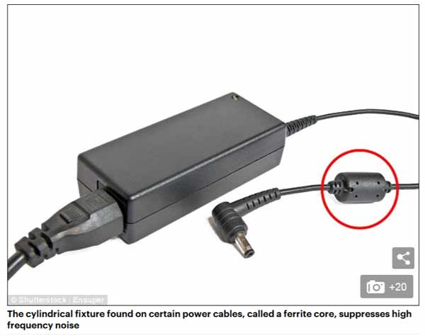 一些充电线上的小圆柱被称为“铁氧体磁珠”,功能是抑制高频干扰信号通过。