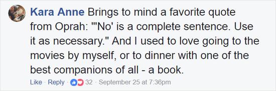这让我想起了奥普拉说过的我最喜欢的一句话:“‘不’是一个完整的句子,你可以在必要的时候使用它。”我曾经很喜欢自己去看电影或者与最好的伙伴“一本书”共进晚餐。