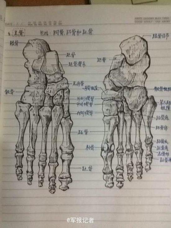 近日,《解放军报》官方微博晒出一组军校学霸的手绘骨骼图,它们出自第三军医大学的学生之手,绘制精细,骨骼图似乎成了素描,被称技术难度一级。网友点赞之余也感叹道“这笔记,我抄都抄不了”。