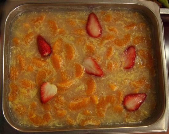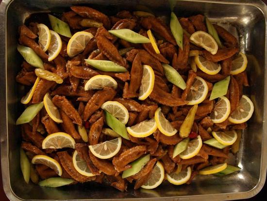 3月13日,浙江农林大学东湖食堂里,柠檬鸡爪、菠萝肉片、凤梨草莓糖排、脆炸香蕉、柠檬鸡尖、西芹炒草莓、橘子鸡蛋羹……