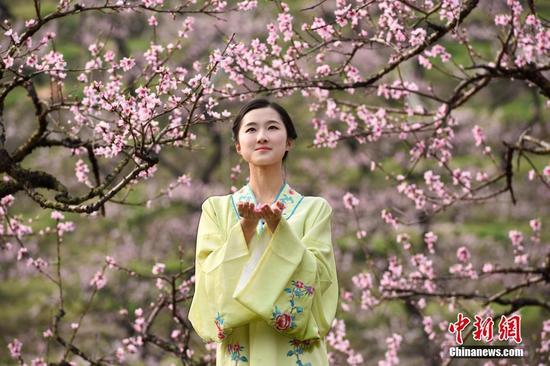 3月14日下午,浙江金华源东乡丁阳岭村万亩桃花盛开,来自金东区某高校的女大学生,身着古装为当地桃花节代言。中新社发 邵勤旦 摄