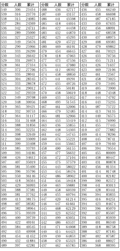 2016年辽宁普通高校招生考生各分数段人数统计表-普通理科公布。详情如下: