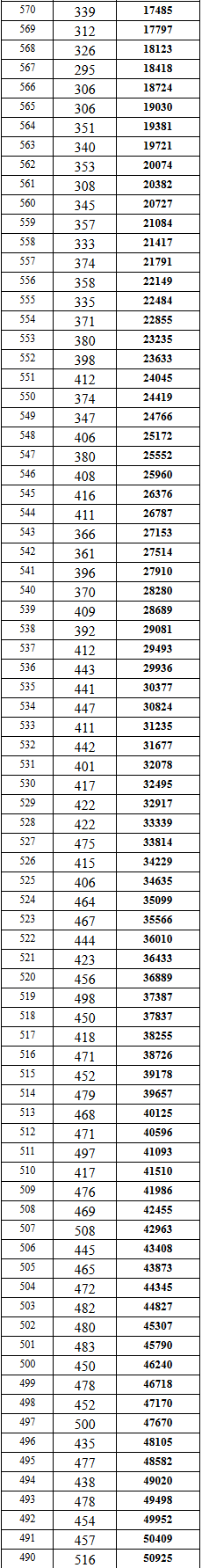 2016年重庆普通高校招生考生各分数段人数统计表-普通理科公布。详情如下: