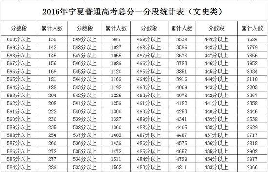 宁夏2016年普通高校招生文史类一分一段统计表已经公布,具体如下: