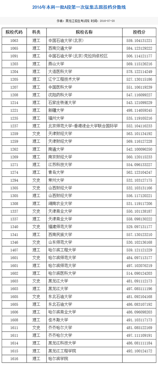 2016年黑龙江本科一批A段第一次征集志愿投档分数线