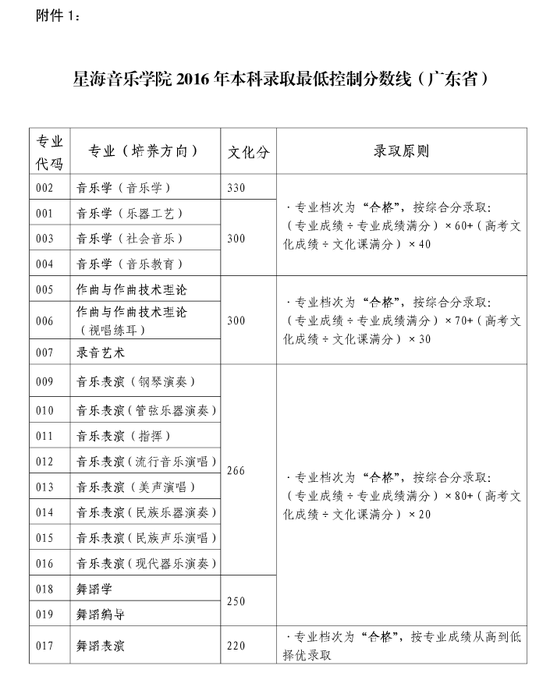 星海音乐学院2016年本科录取最低控制分数线