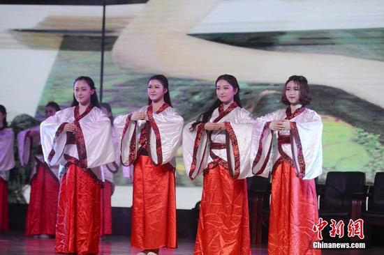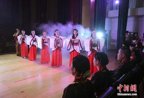 9月26日晚,在湖南女子学院迎新晚会上,众多学生和老师身着古装为新生们上演了一场复古的拜师礼,2000余名新生在现场齐诵《弟子规》,迎接大学新生活。