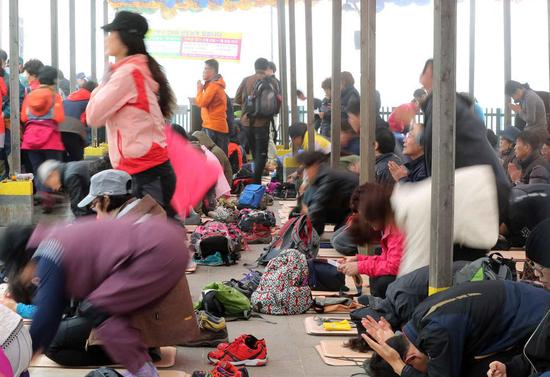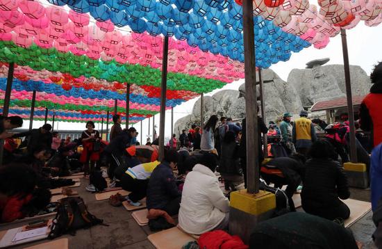 当地时间2016年11月6日,韩国庆山市,韩国2016年度高考将至,考生家长来到八公山为即将参加高考的儿女祈福祷告。