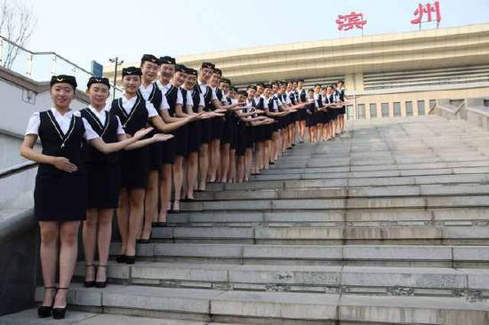 2016年11月30日,山东滨州,即将参加空乘专业测试的女艺考生们在火车站外拍摄写真。