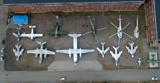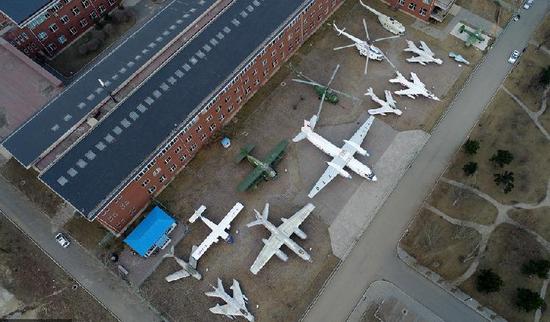 2017年3月27日,辽宁省沈阳市,航拍沈阳航空航天大学校内停机坪,13架飞机加1个反舰导弹,很是壮观。