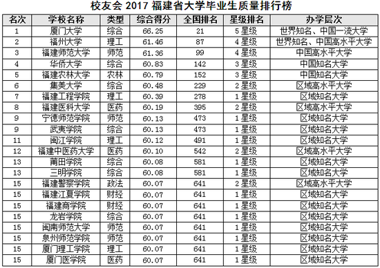 在最新2017中国大学毕业生质量排行榜和2017中国大学教师水平排行榜中,厦门大学、福州大学、福建师范大学、华侨大学、福建农林大学雄居校友会2017福建省大学毕业生质量排行榜前5强;厦门大学、福州大学、福建农林大学、福建师范大学、华侨大学名列校友会2017福建省大学教师水平排行榜前5名。值得关注的是,厦门大学、福州大学入选教育部“全国毕业生就业典型经验高校”,毕业生就业创业工作水平最高,最具示范引领作用。