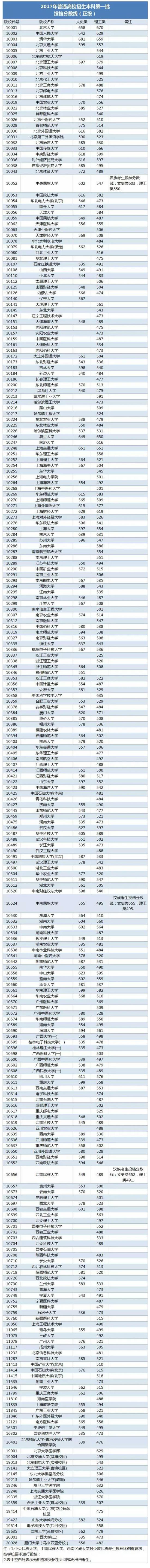 7月13日,广西招生考试院公布2017年普通高校招生本科第一批投档分数线。其中,北京大学(分数线,专业设置)文科投档线658分,理科投档分数线670分,位列分数线榜首。